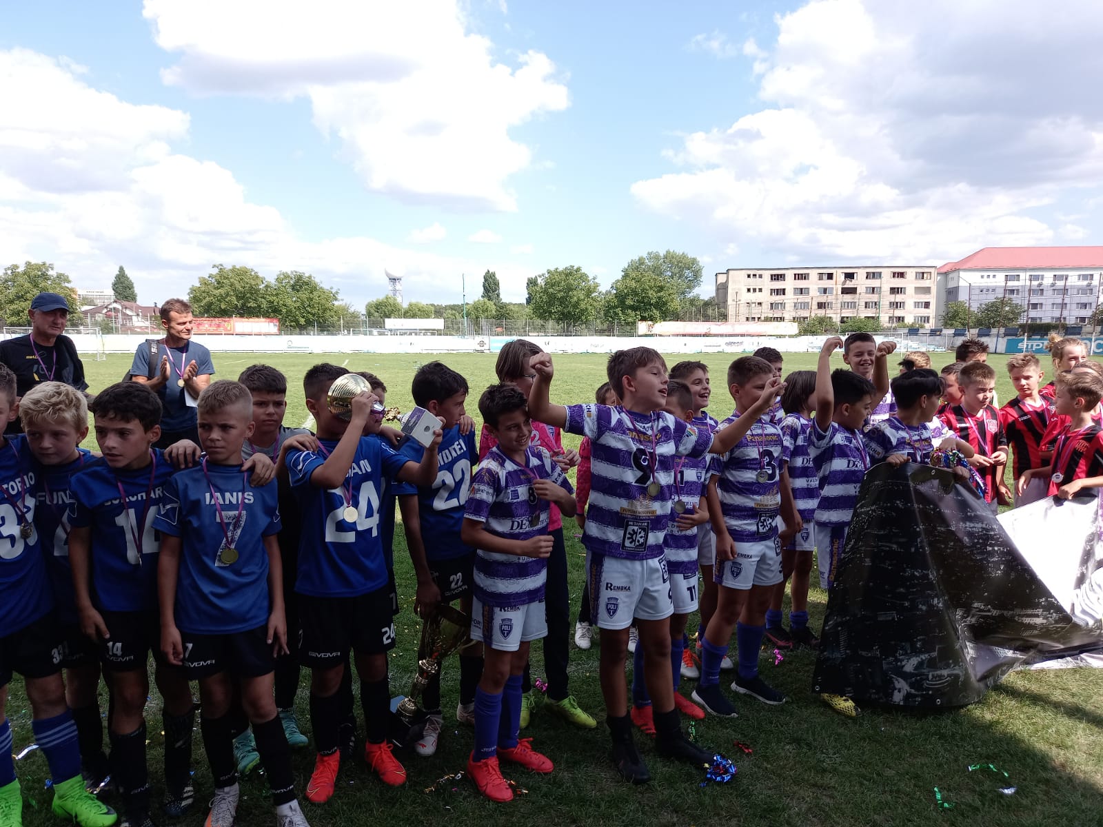Atmosfera a fost animată de părinţi şi galerii, puştii noştri bucurându-se şi de aportul suporterilor din Peluza Sud Timişoara. Susţinere care i-a ajutat cu siguranţă pe alb-violeţii născuţi în 2009, câştigători ai grupei lor după o luptă cu Atletico Arad, scor 1-0. La final cei de pe podium au primit trofee iar toată lumea şi-a câştigat medalia şi diploma aferentă realizării din weekend.
